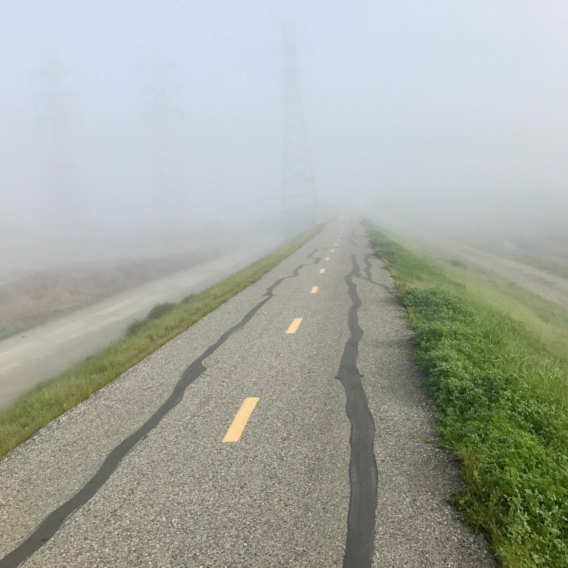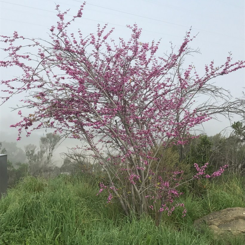 Blooming Cercis occidentalis. Google building behind hidden in today’s fog.