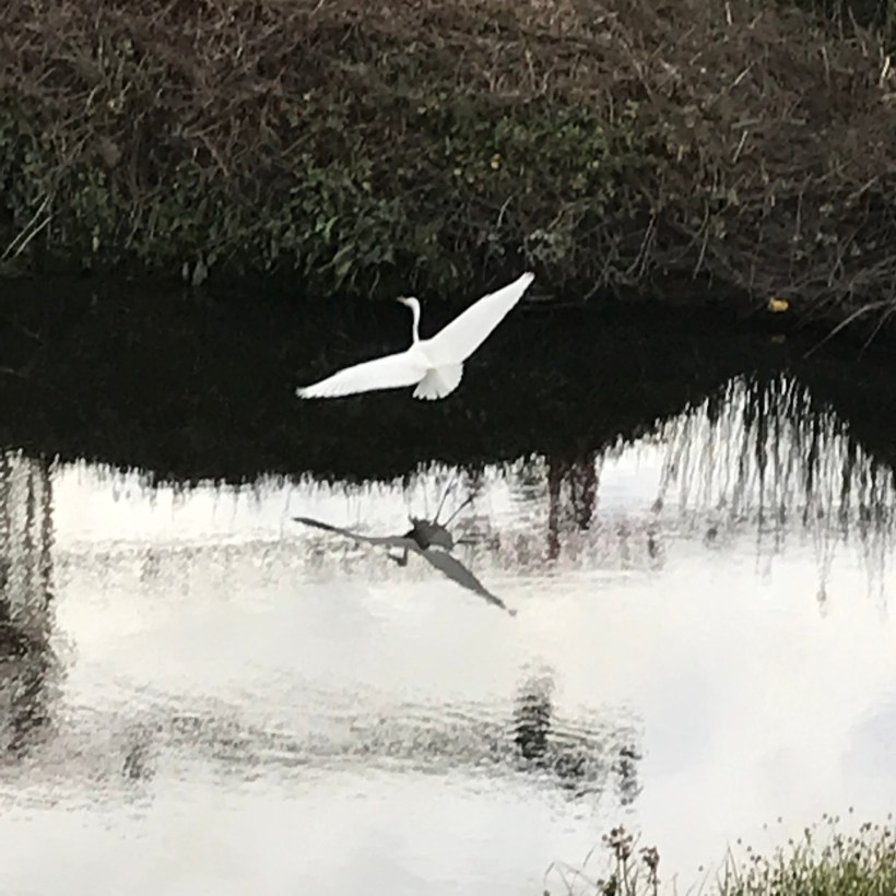 Not until I looked at the photos in my iPhone did I see that the photo of the Egret in flight, with the full wing spread, the white against the near black, and with the refection in the creek was such a magestic image.