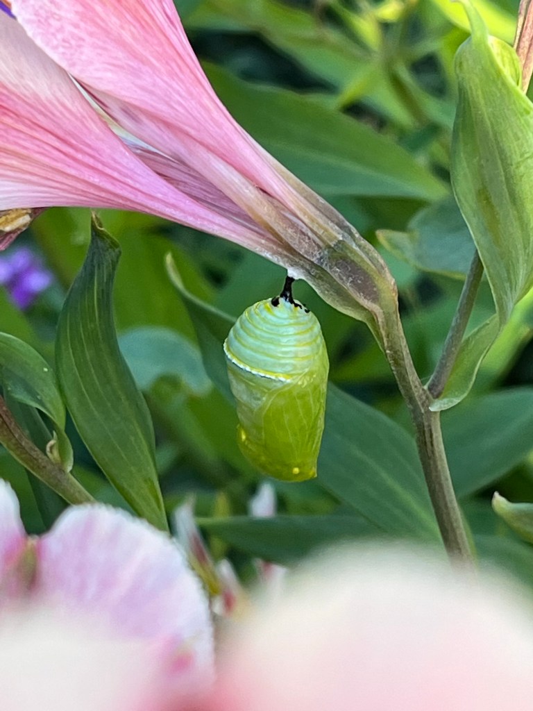 Morning. This is the caterpillar in J stage. It’s hanging with its head down. The backend has cemented itself to the Alstroemeria stem, somewhat sheltered by a leaf. I’m on transformation watch for it to shed its skin. Checking all through this rainy day. Late afternoon. Very far along. Starting from the bottom, it sheds its skin by wiggling to push it up. The skin is that black folded material. The skin moves up, revealing what will be the green chrysalis. It is out of the skin. Sometimes they push they push the black skin entirely away until it falls to the ground. Sometimes it stays there. See the intricacy of the forming chrysalis at the bottom. Getting dark. I’ll have to photograph the final chrysalis in the morning. I’m very excited. This is my first chance to see a caterpillar settling in place, then hanging J stage, then shedding skin. Video of how it gyrates to push away the old skin. Next morning. This is not the final, crystal-like shape of the chrysalis. I will post the final shape, io hope with less rain distorting the surface.