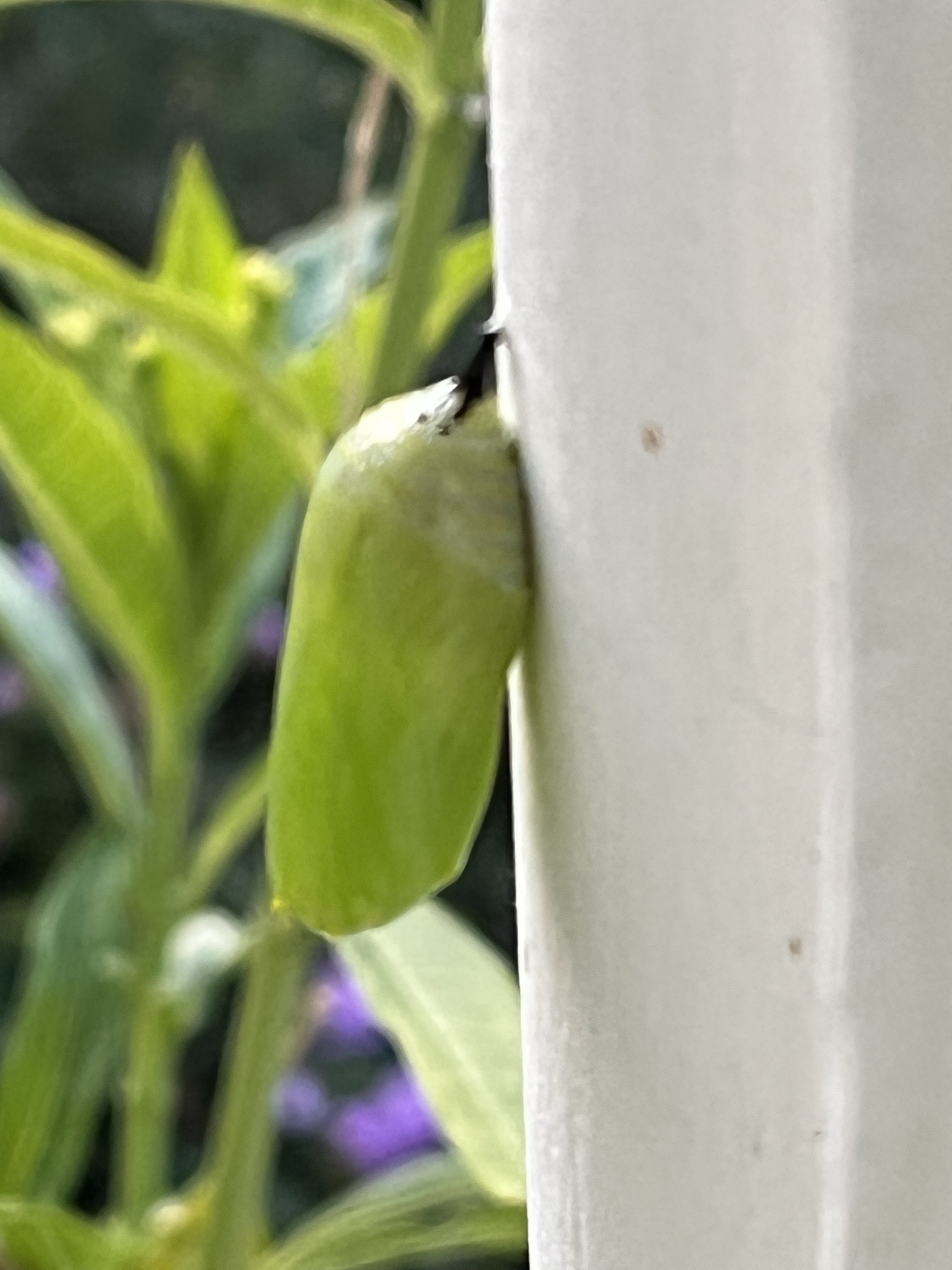 This photo is not in proper focus. But I wanted to capture that in less than three hours it went from caterpillar to chrysalis.
